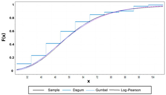 After fitting the statistical functions to the rainfall data, Figure 5 shows graphically how the Dagum distribution is aligned with both the fit of Gumbel distribution and Log-Pearson type III distribution, being difficult to decide the best, since the curves are very close together.