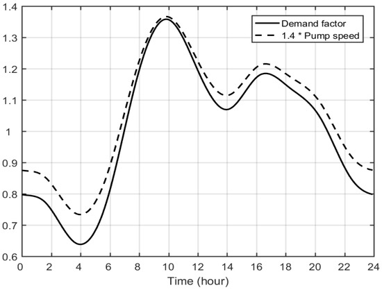 For both a PCV and VSP there are well-known relationships between the change of head over the device and the water flow rate in it, here referred to as “head-flow relationships”. Controllers for a PCV which explicitly depend the head-flow relationship for its derivation were proposed and shown to often outperform a generic proportional controller which do not use the head-flow relationship for its derivation [13,18,19]. A new PCV controller which depends on the head-flow relationship for its derivation was very recently proposed [33]. This controller performs well when compared to the proportional controller. This was verified in a hydraulic model study using the program described above for two example WDNs studied, both of which have one controllable PRV. Four new VSP controllers, which are the first to depend on the head-flow relationship for their derivation, were constructed very recently [34]. Here a hydraulic model of an example WDN, with one controllable VSP, was studied. Most of the new controllers perform better than the proportional controller. Figure 2 shows that the consumer water consumption time-variation, and the time-variation in pump speed needed for RRTC, have a similar dependence in the WDN studied [34]. Here the nodal consumption is based on bulk measurements sampled at 1-h time steps, where the effect of the effect of pulses in the consumption disappears. If shorter time steps are needed, which is generally not the case in water distribution systems, this assumption should be removed to model the effect of pulses in the consumption, which are closer to the real operation of the network [35]. In fact, it has been argued in the latter case that a bottom-up approach with pulsed consumption is needed [36].