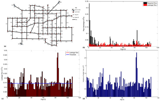 Results of the water network analysis: (a) The case study network; (b) Pipe discharge vs. pipe leakage flow; (c) The pipe leakage flow against the leakage threshold; (d) Volume of water loss in each pipe.