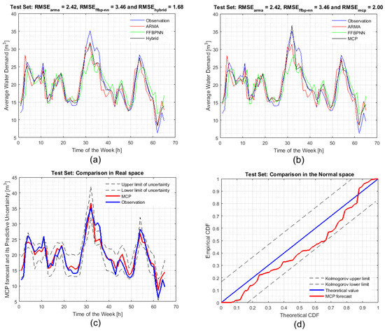 This section tries to show that it is possible to predict the uncertainty connected to the forecast of future demand. To achieve this aim, the predictive performance of ARMA, FFBP-NN, hybrid model (combined forecast from ARMA and FFBP-NN) and MCP is assessed (see Figure 4a,b). This assessment is based on a 168 h (one week) long set of data sampled at hourly time steps estimated from observations by averaging eight weeks of observations. These averages were the only available data from a case study site located in a hydraulic zone in the small city of in south-eastern Spain, which has a population of approximately 5000 consumers. The number of data used for the calibration and validation sets are approximately 60% and 40% respectively, where the first 100 h are used for calibration. In addition, the MCP estimates the future expected value and its predictive uncertainty on the basis of the forecasts generated by ARMA and FFBP-NN (see Figure 4c). Lastly, to show that MCP accurately evaluates the expected utility value, the 5% probability acceptance limit plot is displayed (see Figure 4d).