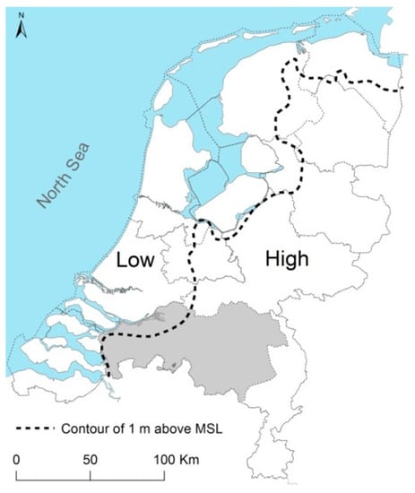 Provinces of the Netherlands (grey: Noord-Brabant) and division of the country in a relatively high part and a low part.