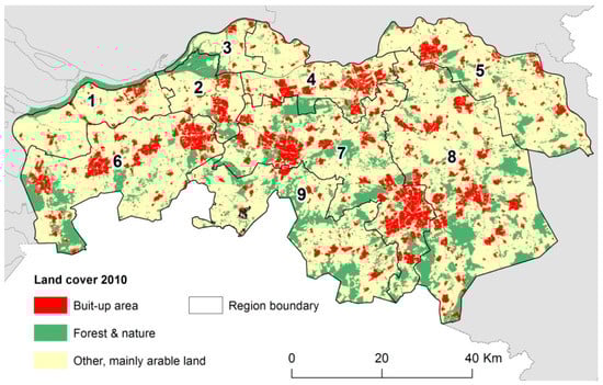 Both main categories of land use (i.e., ‘forest and nature’, ‘urban area’ (built-up area), ‘arable land’, and ‘other’) and crop yields were derived from the only source available for this purpose: Statistics Netherlands (CBS, www.cbs.nl/en-gb/). For crop yields, CBS statistics issued figures for the nine regions within the province that are depicted in Figure 2. These regions have been defined for administrative reasons only; each region comprises a number of municipalities and one central nucleus (usually a city) with an important regional function.