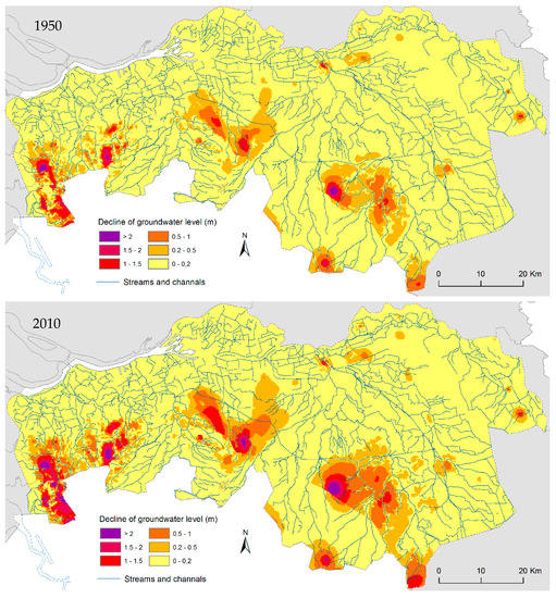 The average drawdown caused by the groundwater extractions of 2010 was 10 cm for the larger groundwater recharge of 1950, while it was 15 cm with the lower groundwater recharge of 2010 (Figure 5). The median drawdown was 3 cm for 1950 and 4 cm for 2010, which is statistically more informative for the impact because of the large drawdown in the immediate vicinity of the extractions. The impact of the abstractions thus increases with decreasing groundwater recharge. In other words, the drawdown of a constant extraction grows as crop production in agriculture increases and the urban area expands. This is due to the non-linear behavior of the top-system caused by the groundwater level dropping below drains and the shift from drainage to infiltration. The latter is associated with higher resistances than the former [29].
