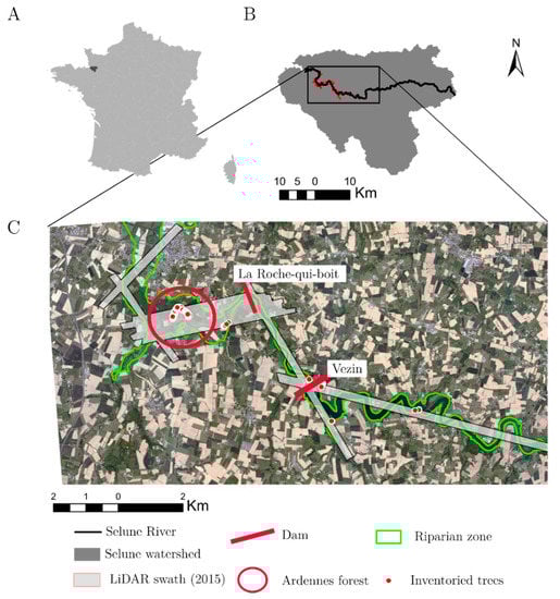 (A) Location of the Sélune watershed, (B) location of the study site, (C) location of the riparian zone and inventoried trees based on dam location and the Laser Detection and Ranging (LiDAR) swath.