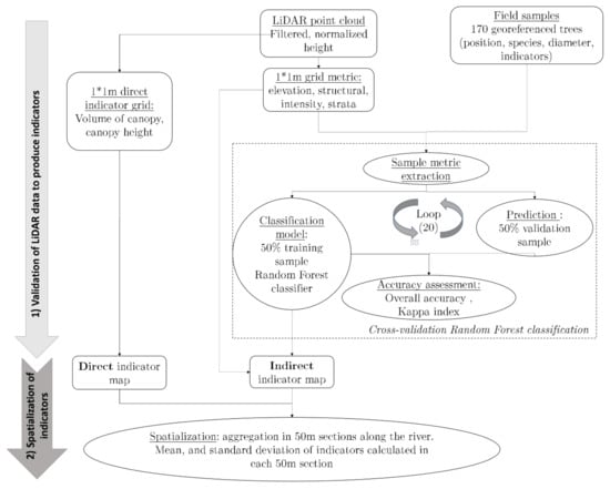 Four indicators of riparian status were produced indirectly using supervised classification: species composition, herbaceous and shrub strata densities, and number of trunks. Species composition is correlated with habitat provision, bank stabilization, and flood regulation; for example, willow is a pioneer species that helps to stabilize banks [31]. Understory strata provide multiple functions; for example, herbaceous cover influences flood regulation [29,33] and sediment fixation [33]. Riparian tree trunks help to regulate floods by resisting flood water [33]. These indicators were produced by applying classification models to several metrics calculated from the LiDAR point cloud.
