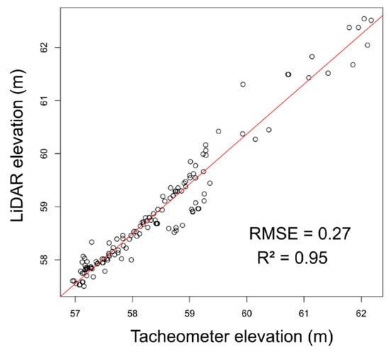 Compared to the tacheometer measurements, the elevation of the bare soil site estimated from the LiDAR point cloud had an R² of 95% and an RMSE of 0.27 m (Figure 3), suggesting a mean difference of 27 cm between true elevation (tacheometer) and LiDAR elevation. Since the study focused on riparian forest properties, the elevations the LiDAR recorded were considered sufficiently accurate.