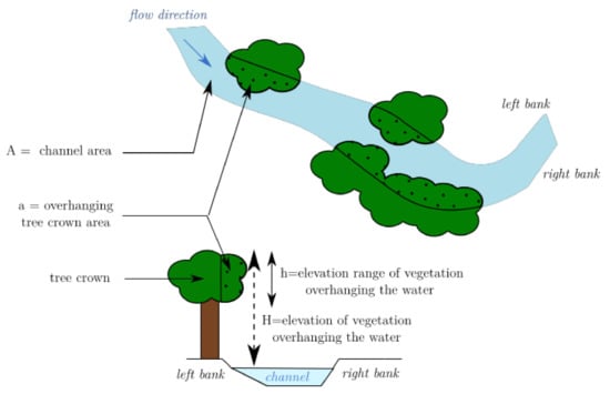 River channel area (A) was estimated using the BD TOPO® database (from the Institut Géographique National). Vegetation polygons were extracted by filtering the CHM. Overhanging vegetation polygons were extracted by intersecting the vegetation polygon with the channel polygon. Overhanging area index was calculated as the percentage of channel area overhung by vegetation. The potential volume of vegetation was estimated using the height of vegetation overhanging the channel in 1 × 1 m grid cells (H). This estimate of biomass can be biased, however, since it assumes that vegetation fills the entire space between the water surface and the maximum vegetation height. Therefore, the “true” volume of vegetation was estimated as the area of vegetation (i.e., tree crowns) overhanging the channel (a) times the elevation range of points overhanging the channel in 1 × 1 m grid cells (h) (Figure 4).
