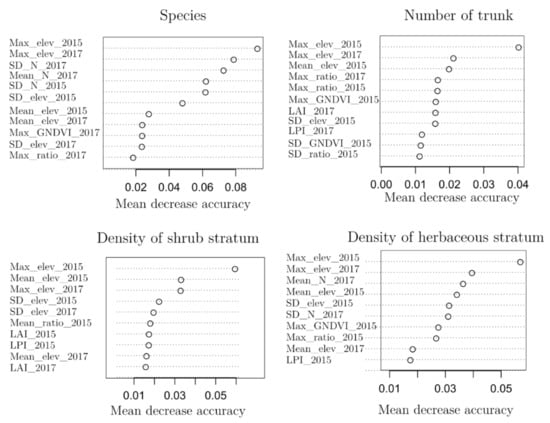 For the four indicators, the elevation metrics of both dates (leaf-on and leaf-off) were kept as the most important (i.e., highest mean decrease accuracy indexes). For species composition, six metrics were kept as important. The standard deviation and mean number of returns for the leaf-off condition were kept as the 3rd and 4th most important metric, respectively. Elevation metrics for the two dates were kept as the most important metrics for the number of trunks and shrub stratum density classifications. For herbaceous stratum density, the mean number of returns in 2017 was kept as the 3rd most important metric. The standard deviation of the number of returns in 2017 was kept as the 6th most important metric, and the maximum of GNDVI in 2015 was kept as the 7th most important metric.