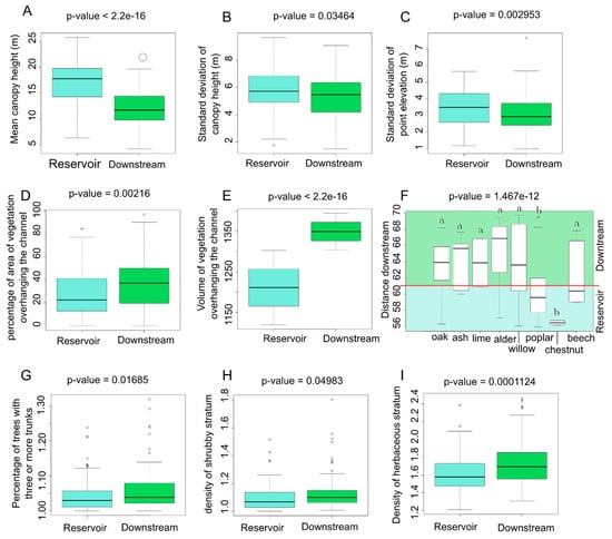 Indicators of riparian functions upstream or downstream from the La Roche-qui-Boit dam. (A) mean canopy height, (B) standard deviation of canopy height, (C) standard deviation of point elevation, (D) percentage of channel area with overhanging vegetation, (E) volume of vegetation overhanging the channel, (F) main tree species, (G) percentage of multi-trunk trees, (H) density of the shrub stratum, (I) density of the herbaceous stratum Whiskers indicate 1.5 times the interquartile range.