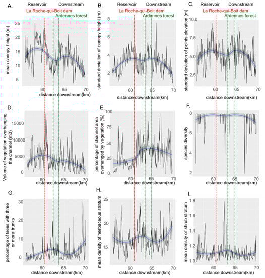 Longitudinal variation in indicators of riparian functions. The blue line corresponds to a loess smoothing function, with 95% confidence intervals represented in the gray region. (A) mean canopy height, (B) standard deviation of canopy height, (C) standard deviation of point elevation, (D) percentage of channel area with overhanging vegetation, (E) volume of vegetation overhanging the channel, (F) tree species diversity, (G) percentage of multi-trunk trees, (H) density of the shrub stratum, (I) density of the herbaceous stratum.
