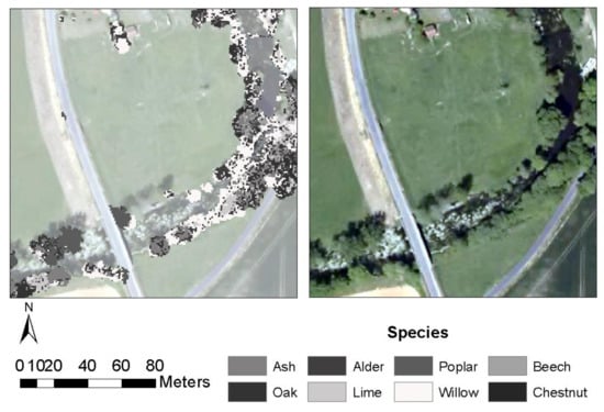 Random Forest classification models predicted the indicators of riparian properties well (≥67% accuracy). This confirms the utility of using Random Forest models to assess riparian structure. This result agrees with that of Michez et al. [14], who used Random Forest to map riparian tree species with unmanned aerial vehicles and LiDAR data with more than 80% accuracy. The maps we produced, however, had some errors. For example, several trees were classified as two or more species (Figure 9) because the top of the crown was classified as a “tall” tree such as poplar, and the external part of the crown was classified as another species. These errors can occur due to overfitting of the Random Forest algorithm, even when using cross-validation. Indeed, the Random Forest algorithm fit the training data closely, and if the predicted data have variability that is not present in the training data, the Random Forest algorithm cannot classify all of the predicted data correctly. This highlights the difficulty in building models that consider all variability observed in the field. For large areas, inventorying the entire area is not possible, or would require expensive and time-consuming effort. The results show the challenge of classifying pixel-based objects such as tree crowns. One solution is to classify tree crowns as objects instead of pixels; however, identifying trees in deciduous forests still requires field research, for no remote sensing method has yet distinguished deciduous trees well.