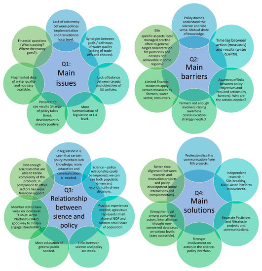 The main limitations of the workshop and interviews are related to the relatively few EU-level actors that were involved in the study. For the interviews we identified 31 individuals and for the workshop 29 EU-level organizations from 3 sectors. These included 9 from the agricultural sector, 11 from the water sector and 9 EC organizations (Directorate-General (DG), EIP). The response rate of the organizations that joined the workshop was 34%, which was an 18% higher participation rate than was received with the interviews. The difference is likely because we invited organizations to the workshop, not specific individuals, so organizations had a broader spectrum of representatives to choose from. In the case of the interviews, it was challenging to get in touch with the invited representatives, as they did not respond to e-mails or phone calls, not even after three attempts. Because answers to specific questions were collected from specific individuals representing science and policy, and due to the limited sample size, it is possible that the answers reported by workshop and interview participants reveal a limited representation of the average opinion of EU-level actors.