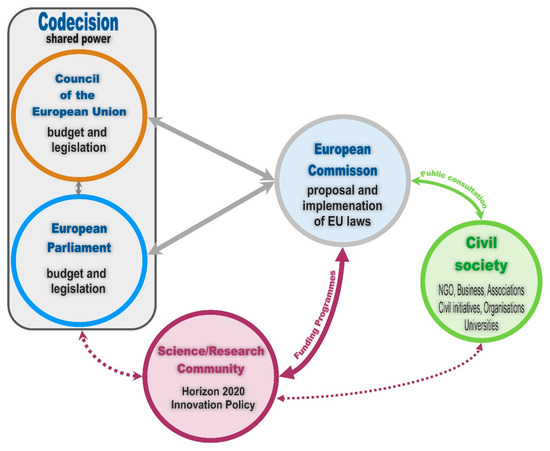 Third, all interviewees and workshop participants pointed out that there should be more opportunities to enhance the role of scientific expertise in policy making. The entry point for the science/research community, funded by the Horizon 2020 program’s call for a decision-making procedure in the EU, is presented in Figure 3. Interviewees from DGs and certain workshop participants who were previously involved in preparing EU legislation stated that the policy cycle is often so fast that there is not enough time to consider the most valuable independent scientific advice, but rather the most available. Moreover, it was expressed that in many EU research projects, dissemination tended to be very formal and bureaucratic, not designed to maximize impact. Some workshop participants perceived that the way the commission uses the results of these projects is unclear. One of the most relevant factors is low resource availability at the European Commission. Where the highest level of technical knowledge and assessment is located within European institutions, there is limited staff available to deal with all EC essential tasks, so less necessary ones like science-to-policy interaction are often not given priority. Some participants think that the CORDIS web platform used by the commission is not always helpful; some stated that it appears that while the EU is funding projects, they are not using the information they provide. An idea was proposed to set up a functional system of disseminating summaries, by topic, to civil servants who could use the information.