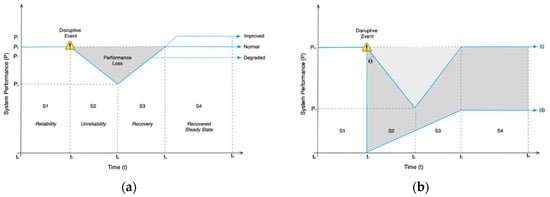 The concept of resilience in this instance would attempt to mitigate against this risk of failure and to ensure the availability of water, even in times of severe conditions, i.e., infrastructure resilience. The resilience curve [17,18] is a common representation of the responsiveness of a system to undergo a disturbance and to recover from it in terms of performance; it has four main stages; reliability, unreliability, recovery, and, recovered steady state [8], as seen in Figure 2a.