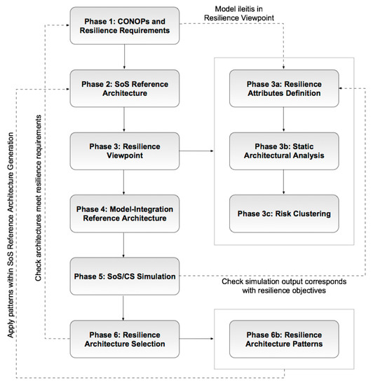 Phase 1 commences with deriving a set of requirements specific to the area of concern and understanding the concept of operations (CONOPs) of the operational systems involved. The tools applied here are rich picture diagrams—a soft systems method [1]—and causal loop models [23,24] to understand the dynamic interactions between system elements. Subsequently a reference architecture [1,4,25] is created using systems modelling languages such as SysML and the Department of Defense Architecture Framework (DoDAF) [26] which is common language used to create systems architecture descriptions of systems and enterprises.