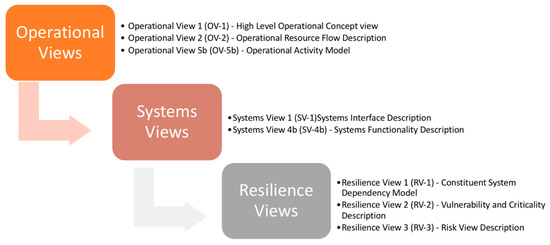 A novel viewpoint within the framework has been created solely focused on the resilience aspects of the architecture, and proposes three model types (Figure 4) to address; static structural analysis of the nodes within a network of systems and to explore the cascading effects of a failure or disruption; risks and those who are responsible for mitigating against risks, and; resilience attributes which are being designed into the architecture, for example, non-functional features referred to as “ilities” [30,31] such as flexibility, robustness, security, and availability. These non-functional properties are assessed through observation from the subsequent simulation models created in the next phases of the methodology.