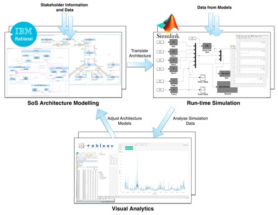 This process is illustrated by Figure 5, where IBM Rhapsody architectures are manually translated into Simulink for simulation, and subsequent analysis in an additional visual analytics tool, in this case Tableau software (Tableau Desktop 10.5, Seattle, WA, USA). Simulink was selected as it permits the use of sliders and other parameter controls as the simulation runs in real-time. This enables decision makers to explore different parameters and immediately visualize the outputs.