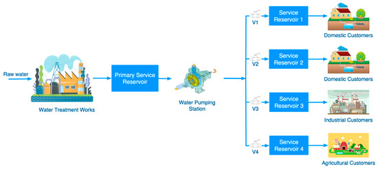 This case study considers a scenario where flooding has resulted in pump failure (directly from flood water or from power failure), where the pump is a constituent system that forms part of the SoS. If we consider this case and assume that the flood has created a redundancy problem as the pump supplies multiple demand points within a network, it becomes evident that this challenge is greater than a redundancy problem and we must consider alternative resilience strategies to overcome the difficulties. Let us consider demand centres which are supplied by a water source of some kind (e.g., primary service reservoir) and utilise a pump to feed water up against gravity, to a set of demand centres via a number of service reservoirs. Of the four demand centres as seen in Figure 6, it is assumed (for demonstration purposes) that two are for domestic use, one for industrial and one for agriculture.