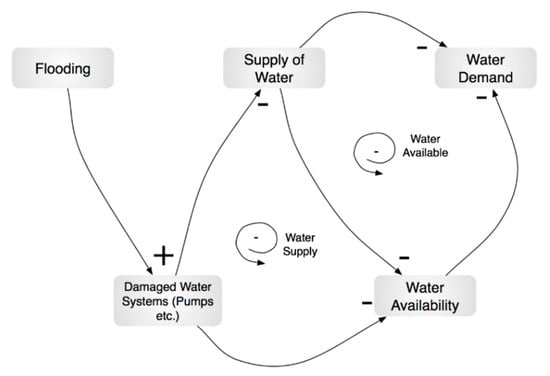 Following the phases outlined previously in Figure 3, a great understanding of the water SoS is achieved through applying CONOPs methods such as rich picture diagrams (Figure 1 and Figure 6) and causal loop models (Figure 7). The advantages of causal loop diagrams are that it helps analyse complex systems and helps identify key dynamic variables for later simulations. Cause and effect diagrams are a crucial aspect of designing resilience systems, particularly for understanding the dynamics between key variables. The loops which are created show an overall effect on the system and this is one of the elements of a causal loop diagram as illustrated in Figure 7, where the overall effect is a decrease in water available due to damaged infrastructure in times of a flood event. Although this seems a basic construct, reducing to this level of complexity is beneficial in exploring potential solutions, and determining the types of data sets required for simulating later in the process. Thus, from the causal loop it can be determined that the solution that needs exploring is the flexibility of the current systems in place to search for strategies and also architectural solutions which regulate the availability of water and hence, the supply of water to those that require it.