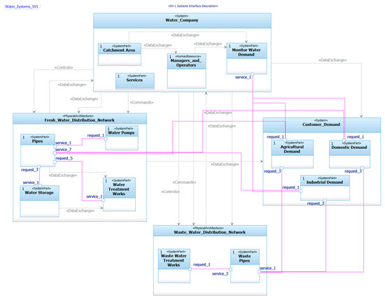 The reference architecture forms the backbone to the methodology as it defines the interactions between constituent systems (CS) and sub-elements within the water SoS. A reference architecture, as the name suggests is a source of reference when regarding systems from different architectural perspectives. A set of views that form the reference architecture are shown in Figure 4. The architecture is a resource which is typically shared amongst project stakeholders, and engineering teams in the development phases of software, a product, a service, a system or an SoS. A common set of information is one of the key benefits of model-based systems engineering (MBSE) [27,28,29] and the purpose of a reference architecture, which is an MBSE practice.