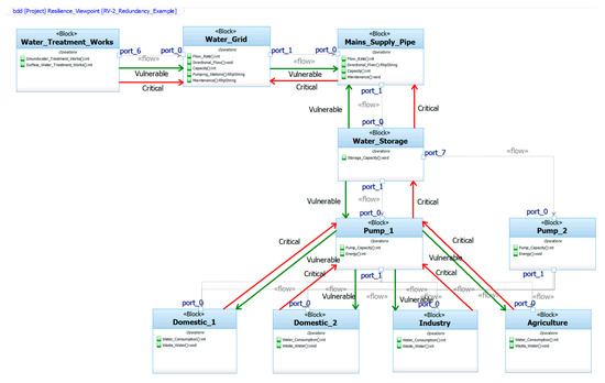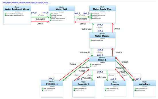 Subsequently, modelling the system using the resilience viewpoint (more specifically, Resilience View 2—RV-2) allows the engineer to highlight which nodes are critically dependent on each other and also to show which nodes are vulnerable if failure was to occur at some point in the network. For instance, modelling the case study example, shown in Figure 6, the viewpoint shows the four demand points being critically dependent on the functioning of the pump, and vice versa, the demand points being vulnerable on the pump failing. Similarly, the water storage component, or the primary service reservoir becomes vulnerable if the pump is no longer working, because that clean water has a set period which it can be stored for before becoming unsafe to distribute. Figure 10 shows the capability of RV-2 to model further details of each SoS component, for instance, the main supply pipeline has certain attributes which can be assigned to that element. These may include important parameters such as flow rates, flow direction, capacity, and others which are important in later simulation phases.