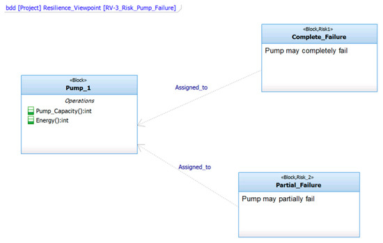 From a risk perspective, the resilience viewpoint offers a model (Resilience View 3, RV-3) to capture risks which can be communicated with all stakeholder groups. Additionally, the risk view as illustrated in Figure 12, permits the architect or engineer to allocate the risks to constituent systems or stakeholders within the water SoS. This allocation of risks establishes responsibility of each identified risk and provides accountability to whom or to what is responsible for mitigating against that risk. The advantage from an architectural perspective is that risks can be avoided if mitigation strategies are embedded within the design of constituent systems. An example of an RV-3—Risk View Description—is shown in Figure 12. The example shows the risk of failure (or partial failure) of the water pump from the above example. Although this a simple example for demonstration purposes, the number of risks in a scenario like this are likely to be in the tens or hundreds, and this is a valued way to manage these risks as the complexity can be captured in multiple instances. This view (RV-3) within the resilience view package is a novel inclusion to the architecture framework which historically does not consider risks (in this way) as part of the architecture modelling phases of systems lifecycle modelling or development.