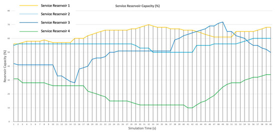 The Simulink model as seen in Figure 13 shows the element that reflects the problem scenario outlined in Figure 6, which looks at the use of pumps and valves to carry water from a primary reservoir, against gravity, to four service reservoirs which supply different types of customers (domestic, industry and agricultural). The model enables the user to set desired tank levels and the prescribed levels and to then manipulate the pumps and valves to direct water to specific service reservoirs depending on the resilience strategy in place. This specific strategy focussed on keeping the supply high to the two domestic customer groups i.e., service reservoirs 1 and 2, and to drop the amount of water being supplied to agriculture for the short term in order to maintain water to the domestic and industry customers. Preliminary results for this simulation run can be seen in Figure 14 where the domestic customers and their respective service reservoirs remain constantly at a high water capacity and the agricultural service reservoir (service reservoir 4) remains low. Service reservoir 3, the industry service reservoir fluctuates depending on the demand.