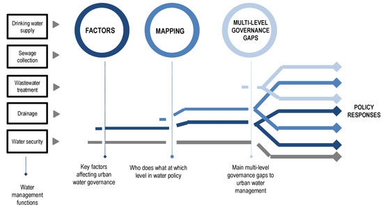 In order to identify challenges and responses, the OECD employed an analytical framework that combined: (i) an assessment of the key factors affecting the effectiveness of urban water governance; (ii) a mapping of the roles and responsibilities at different levels of government; (iii) an appraisal of the main multi-level governance gaps to urban water management; and (iv) a focus on the policy responses to mitigate fragmentation and to foster integrated urban water management in cities and their hinterlands [3] (Figure 2).