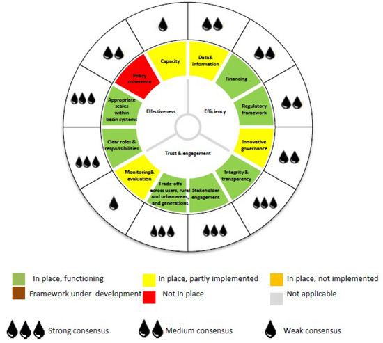 Cities can greatly benefit from the multi-stakeholder process to acquire information for each indicator. In fact, the self-assessment should be carried out in a participative manner in order to ensure that the process is transparent, neutral and open, as indicated by the 10-step methodology for self-assessment [16]. An open dialogue across stakeholders can inform policy makers in cities on the state-of-the-art of water governance and future expectations. This assessment in fact takes into account the diversity of opinions during the discussion. For each indicator, the assessment is complemented by the level of consensus amongst stakeholders. This is visually represented by water drops from 1 (low level of consensus) to 3 (high level of consensus) (Figure 4).