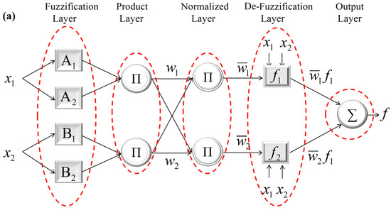 In the first layer, each node adjusts to a function parameter. The output of the “fuzzification” layer is a value of membership degree that is estimated using the inputs of MFs.