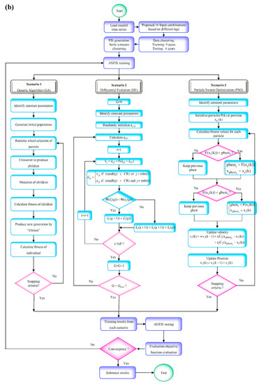 (a) Adaptive neuro-fuzzy inference system model architecture for 2 inputs and 1 output, (b) General flow chart of a hybrid ANFIS model for different scenarios.