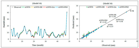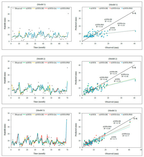 Time series and scatterplot of observed and forecasted rainfall by three hybrid models, namely, ANFIS-particle swarm optimization (PSO), ANFIS-genetic algorithm (GA), and ANFIS-differential evolution (DE), and the classical ANFIS model for different input combinations over the testing phase of the models.