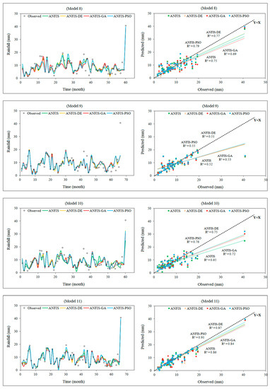 Comparative plots of observed and forecasted rainfall patterns obtained using ANFIS-based, ANFIS-PSO, ANFIS-GA, and ANFIS-DE models.