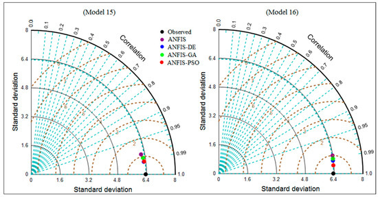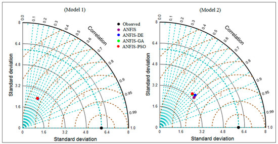 Figure 4 shows a graphical presentation using Taylor diagrams [47]. A Taylor diagram is a method for graphically condensing how intently a model (or several models) matches observations. The similarity between the predictive models and the observation records is quantified in terms of their correlation coefficient and standard deviations. The figures outline the proposed hybrid models and the comparable ANFIS-based model in terms of the mentioned indictors to denote the degree of the prediction skills. The distance from the reference point (observed) is a measure of the centered RMSE [47]. Accordingly, a perfect model (being in full concurrence with the observations) is set apart by the reference point with the correlation coefficient equivalent to 1, and a similar abundancy of varieties contrasted with the observations [48]. The visualization of results revealed that the ANFIS-PSO model results were closer to the observation points than the ANFIS-GA, ANFIS-DE, and ANFIS-based model results, reaffirming the better accuracy of the hybrid ANFIS-PSO.