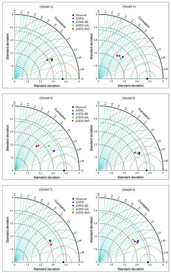 The proficiency of the different models was also examined using some graphical presentations, such as observed rainfall values versus forecasted values in scatterplot graphs and Taylor diagrams. The time variation and scatterplots of observed versus simulated hybrid models are provided in Figure 3. It is obvious form the figures that the values given by the ANFIS-PSO, ANFIS-GA, and ANFIS-DE are closer to the observed values than those of the ANFIS-based model for most of the input combinations. Based on the presented scatterplots of observed and forecasted rainfall and assuming the trend line as (a and b are the coefficients of fit line), it can be seen that for the hybrid ANFIS-PSO, ANFIS-GA, and ANFIS-DE, the a and b coefficients are closer to 1 and 0 with a higher determination of coefficient values.