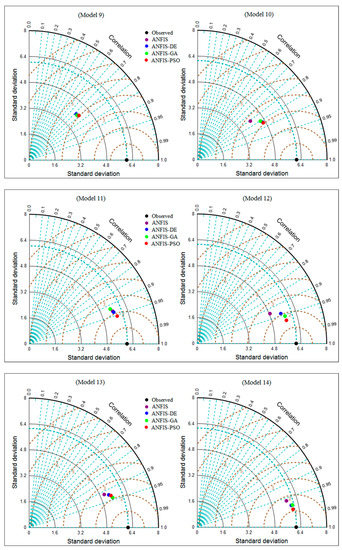Taylor diagrams for the graphical presentation of the performance of three hybrid models, namely, ANFIS-PSO, ANFIS-GA, and ANFIS-DE, and the classical ANFIS model for different input combinations during the testing phase of the models.