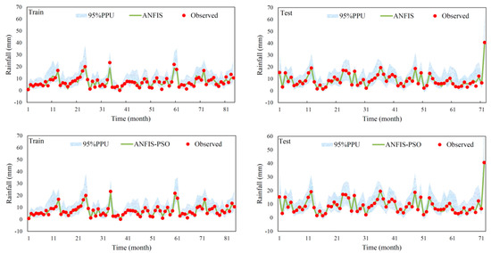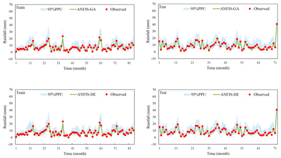 In accordance with the established research [49], the computed value for 95PPU should be considered at least 80% of predicted values, whereas, for some areas, the use of 50% of data in the 95PPU bound is acceptable. Due to the values attained for all ANFIS-based models for the d-factor and 95PPU, it can be derived that all observed and predicted values are within the 95PPU band for all models except model 1 which used lag 1 as the input variable in rainfall forecasting so that 50% of the observed data fell within this bound. By considering the minimum value of 95PPU as 80% of predicted values, models 12 to 16 for all ANFIS-based models are within this 95PPU level. Therefore, for all models except model 1 and especially for model 12s to 16, the “passing” degree of uncertainty is achieved in rainfall forecasting. Simulation results for hybrid ANFIS models are better than individual ones because the percentages of values bracketed by 95PPU for hybrid evolutionary ANFIS are higher than those of the ANFIS. In addition, the best and worst uncertainty values are found for ANFIS-PSO and the ANFIS which have the lowest and highest (respectively) values for different input combinations.
