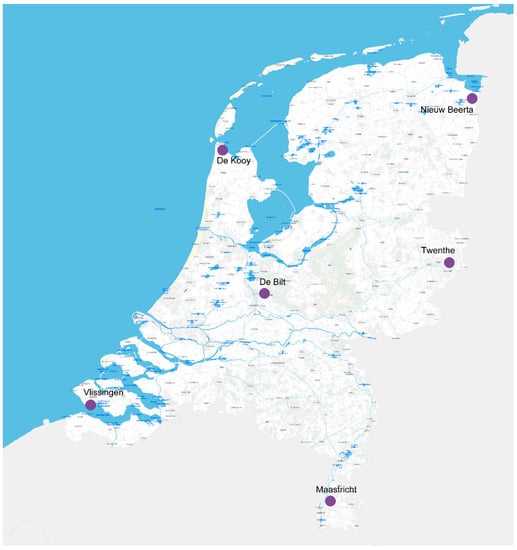 Data of 25 meteorological weather stations and 325 stations for deposition measurements across the Netherlands, gathered between 2006 and 2016, were studied []. During this period the yearly amount of rain increased from 814 mm to 856 mm due to the occurrence of more heavy showers. The amount of water that can be harvested depends on the run-off coefficient: the ratio of rainwater that can be harvested to the total amount of rainwater that falls on a roof. This factor depends on the type and angle of the roof, the dominant wind direction, the intensity of the showers and the amounts of water that are “lost” as a result of evaporation or leakage. The run-off coefficient varies between 0.7 and 0.95, with an average value of about 0.8 []. If both the run-off coefficient and a first flush of 2 mm are applied to the deposition data, the percentage of rainwater that can actually be harvested appears to be about 50%, as shown in Table 2. The data in Table 2 refer to the weather stations shown in Figure 1. For these calculations, all showers with rainfall below 2 mm (the first flush), were not taken into account. The total amount of rainfall appeared to be practically the same over the whole country. In some parts of the country, like Nieuw Beerta, however, relatively more small showers occurred, as a result of which a larger part of the total rainfall was discarded. However, in general it was concluded that the differences in type of rainfall over the country were small.