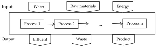 This analysis is based on the concept of the industrial water footprint and its evaluation framework. The system boundary for evaluating the water footprint of the industrial ethanol production stage in a factory accounts for inputs (water, steam, and energy) and outputs (effluent, waste, and product). The water used by staff and the consumption of water resources to produce goods supplied by agriculture, forestry, animal husbandry, fisheries, and natural ecosystems were not included in the evaluation [37]. The system boundary of industrial water footprint evaluation is shown in Figure 2.