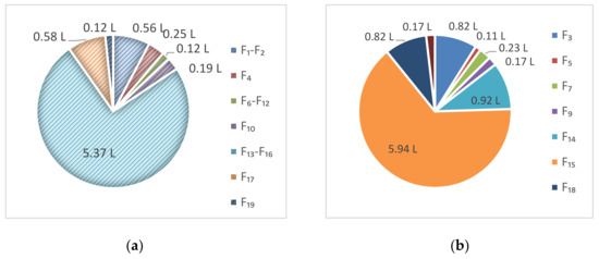 In calculations of the industrial water footprint, the green water footprint mainly comes from the use of collected rainwater. This plant does not collect rainwater, so the green water footprint was ignored. As shown in Figure 3, the WF of the ethanol plant was 17.08 L/L ethanol. The BWF was 7.69 L/L ethanol, which is less than the 8.30–18.97 L/L ethanol BWF of a cassava-based ethanol plant in Thailand [38], and close to the result of a study in Guangxi, which was 7.60 L/L ethanol [13]. The GWF in the study plant was 9.39 L/L ethanol, which is less than the 11.46 L/L ethanol resulting from the study in Guangxi because the sewage and polluted process water were treated to a high standard before discharge to the receiving water body. All these points illustrate the study plant has a good level of water management.