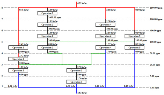 The preliminary block diagram concentration-interval boundaries, which included the reuse water operation, was created using the software Water Design, as shown in Figure 5. The water discharged by operation 3 can be reused in all other operations, and the water discharged by operation 1 can be reused in operations 2, 4, and 5. The volume of water lost was very small and therefore, it was ignored in the diagram.