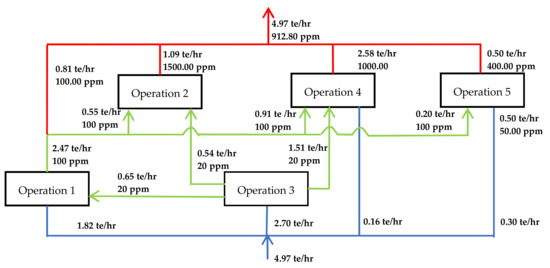 The water network was then optimized, as shown in Figure 6. The flow rate of reused water from operation 3 to operation 5 was very low and it was therefore replaced by fresh water. The final minimum fresh water consumption was 4.97 te/hr. Furthermore, because water loss was ignored, the effluent discharged was also 4.97 te/hr.