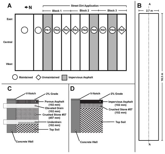 (A) Site plan of the porous asphalt cells. Maintained cells were cleaned annually with a regenerative air street sweeper. (B) Dimensions of each test cell. The dashed line (A-A) shows the cross-section locations of porous asphalt (C) and impervious asphalt (D) cells.
