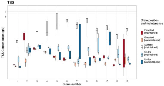 The geometric mean was chosen to describe the central tendency of a set of per-storm measured (concentration) data since it incorporates every value in a sample set, and is more robust to outliers. For example, the geometric mean was used to determine the mean concentration of Total Suspended Solids (TSS) emanating from all elevated drains in all three maintained PA cells, during Storm 1. Similarly, the mean TSS concentration emanating from unmaintained elevated drains during Storm 1 was defined by calculating the geometric mean of TSS concentrations measured at the three elevated drains of the three unmaintained PA cells. These geometric mean concentration values were always calculated on a per-storm basis and then further grouped by drain position or maintenance regime. Geometric mean values specific to a storm and a drain position were then used in Equation (1) to calculate ΔC for every storm, and for both PA drain positions (e.g., TSS removal efficiency at the elevated drain during Storm 1). The median of calculated pollutant removal efficiencies for all storms was then used to characterize the overall removal efficiency of an analyte at a specific drain position (e.g., median TSS removal efficiency at the elevated drain across all storms).