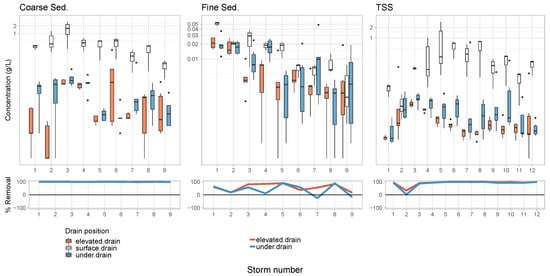 Sediments were analyzed as fine (< ) and coarse (> ) sediments, as well as by measuring TSS content. Of all three analytes comprising the sediment group, coarse sediments had the highest removal efficiencies at both elevated drain and under drain positions, across all measured storms. The median removal efficiency for coarse sediment at the elevated drain and under drain were 99.7% and 98.7%, respectively. Effluent concentrations of coarse sediment at both drain positions were significantly different from surface drain effluents coming from IA cells. Similarly, TSS concentrations from both drain positions of PA cells, were significantly different from surface samples obtained at IA cells. Removal efficiencies for TSS at elevated drains and under drains were 97.3% and 93.4%, respectively. Fine sediments performed the worst, with median removal efficiencies at the two drains measured at 59.4% and 57.0%, respectively. There were no significant differences between samples obtained from IA cells and PA cells. There was a net export of fine sediments observed for Storms 7 and 8 at the under drain position. Median removal efficiencies, number of samples, and p-values associated with Mann–Whitney U-tests for the three sediment analyte classes are presented in Table 2. Of the three sediment types, coarse sediments were consistently removed at the highest rates with little variation across all storms (Figure 3). None of the three sediment analytes showed significant monotonic trends in removal efficiencies with system age (storm number).