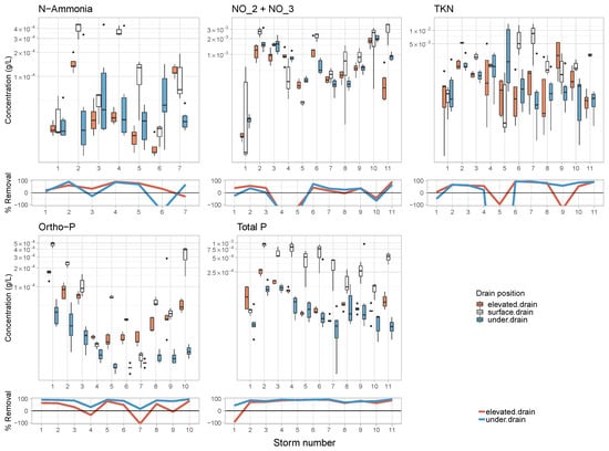 Of the nutrients evaluated, total phosphorous was removed at the highest level at both elevated drain and under drain positions. Median removal efficiencies across all storms was 82.7% and 87.7%, at the elevated drains and under drains, respectively. The geometric means of per storm concentrations were significantly different between surface versus elevated drains (Mann–Whitney statistic U = 0, p = 0.018) and surface versus under drains (U = 18, p = 0.014). Median removal efficiencies of ortho-P were highest at the under drain position (86.0%) and significantly different from surface samples (U = 18, p = 0.014). Ortho-P removal efficiency at the elevated drain was also significant (U = 0, p = 0.018) with a median removal efficiency of 53.4%. However, it is important to note that every nutrient analyte exhibited export at either the elevated drain, or the under drain for at least one storm event. In Figure 4, the lower row of sub-figures illustrates this issue where every analyte crosses the 0% removal (export) line at least once, with the exception of ortho-P and total P at the under drain position where there is removal across all storms. Both N-ammonia and Total Kjeldahl Nitrogen (TKN) were removed at significant levels at the under drain position, despite a large export of TKN at the under drain during Storm 5. TKN removal efficiency was also significant at the elevated drain. Median removal efficiencies, number of samples, and p-values associated with Mann–Whitney U-tests for the six nutrient analyte classes are presented in Table 2. Of all nutrients analyzed, total P was the most consistently removed across all storms and at both drain positions. None of the five nutrient analytes showed significant monotonic trends in removal efficiencies with system age.
