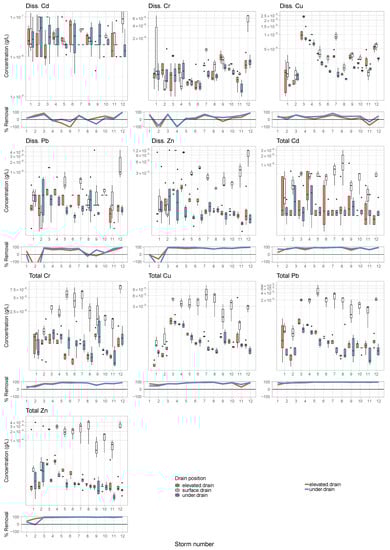 The removal of metals by porous asphalt at the elevated drain was most pronounced for total Pb (96.3%) and total Zn (95.0%); both analyte concentrations were significantly different when compared to surface concentrations from IA cells. Total Pb and total Zn were also removed at the highest rates at the under drain position Figure 5; again, both analyte concentrations at the under drain were significantly different from surface IA samples. In the dissolved phase, dissolved Zn had a median removal efficiency of 85.5% across 12 storm events. Other dissolved metals fared relatively poorly in terms of removal efficiencies; most median removal efficiencies at both drain positions were below 50.0% with the exception of dissolved Zn and dissolved Pb. A listing of heavy metal removal efficiencies, p-values associated with the Mann–Whitney U-test, and the number of samples is presented in Table 2. Removal efficiencies of total Pb showed an increasingly monotonic trend with system age at both the elevated drain (Kendall’s Tau = 0.56, p = 0.01, Theil–Sen slope estimate = 0.42% increase per storm) and under drain ( = 0.51, p = 0.02, Theil–Sen slope estimate = 0.75% increase per storm). Total Zn also showed a low, but significant increasing trend in removal efficiencies with system age at the under drain ( = 0.61, p = 0.005, Theil–Sen slope estimate = 0.04% increase per storm).