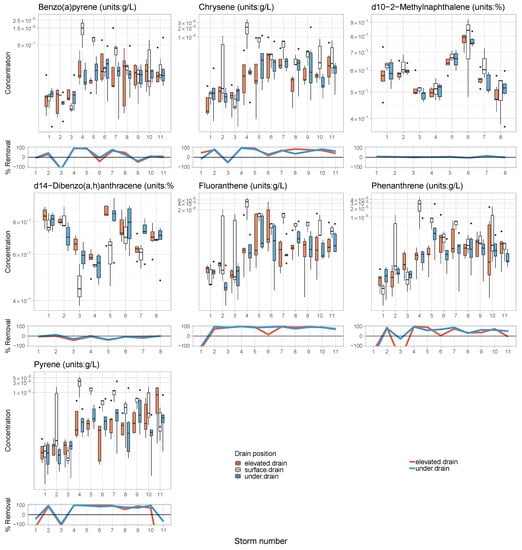 Removal efficiencies for PAHs at elevated drain and under drain positions across measured storms. Removal efficiencies below −100% (or over 100% export) are not shown, and why some line graphs appear broken.