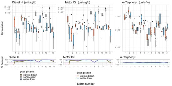 The highest median removal efficiency of any TPH analyte was motor oil, which was highest at both elevated drain and under drains, followed by diesel H.removal. The third highest removal of a TPH analyte was o-terphenyl which exhibited negative removal efficiencies (Figure 7) for all 12 storms at both elevated and under drain positions. Elevated drain and under drain samples from PA cells for both motor oil and diesel H. were significantly different from corresponding surface IA samples. These two analytes exhibited positive removal efficiencies for all sampled storms with the exception of Storm 1 when removal efficiencies for both analytes at the elevated drain position were below −400% (not shown in Figure 7). A listing of all TPH removal rates, p-values associated with the Mann–Whitney U-test, and number of samples from different drain positions, is presented in Table 2. Removal efficiencies of diesel H. showed an increasingly monotonic trend with system age at the under drain ( = 0.51, p = 0.02, Theil–Sen slope estimate = 0.10% increase per storm). Motor oil also exhibited a significantly increasing trend in removal efficiencies with system age, also at the under drain ( = 0.48, p = 0.03, Theil–Sen slope estimate = 0.06% increase per storm).