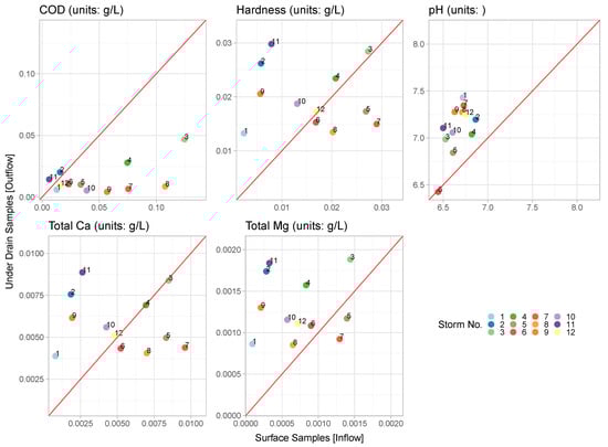 The increase in pH values in most samples from slightly acidic to slightly basic, between the surface drain and the under drain, highlights the buffering capacity of the granitic material used in the reservoir course [], and of the porous asphalt system as a whole when granitic material is used in the reservoir course. Knauss and Wolery [] showed that mineral quartz dissolution, a major mineral in granitic rocks, increases as pH levels in the water that the rock is in contact increase above a threshold value of six.